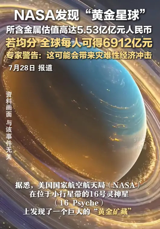 美国国家航空航天局(NASA)在小行星带发现的灵神星(16 Psyche)因其丰富的金属资源引发广泛关注。这颗小行星主要由铁、镍和贵金属(如黄金、铂等)构成,初步估算其总价值高达700万亿欧元(约5.53亿亿元人民币)。如果将这些资源平均分配给全球80亿人,每人理论上可获得约875亿欧元(约6,912亿元人民币)。然而,专家指出,真正实现开采并利用这些资源仍面临诸多挑战。